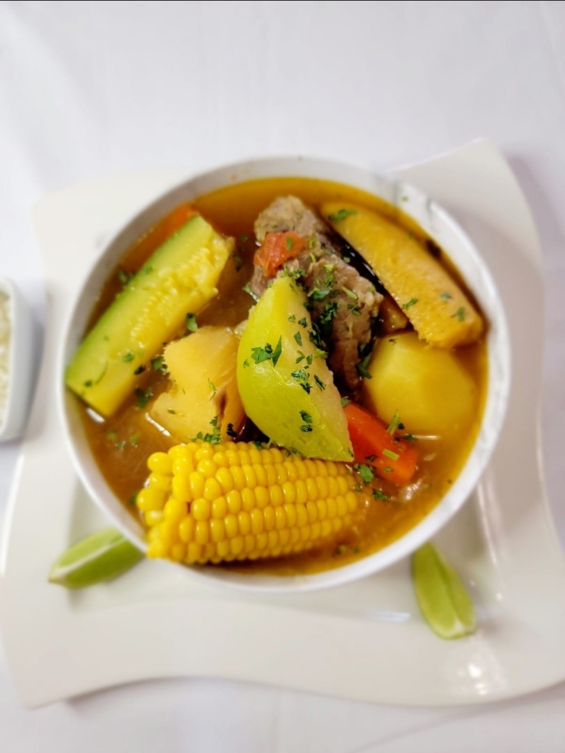 Hearty Honduran beef soup with vegetables, yuca, corn, and traditional spices