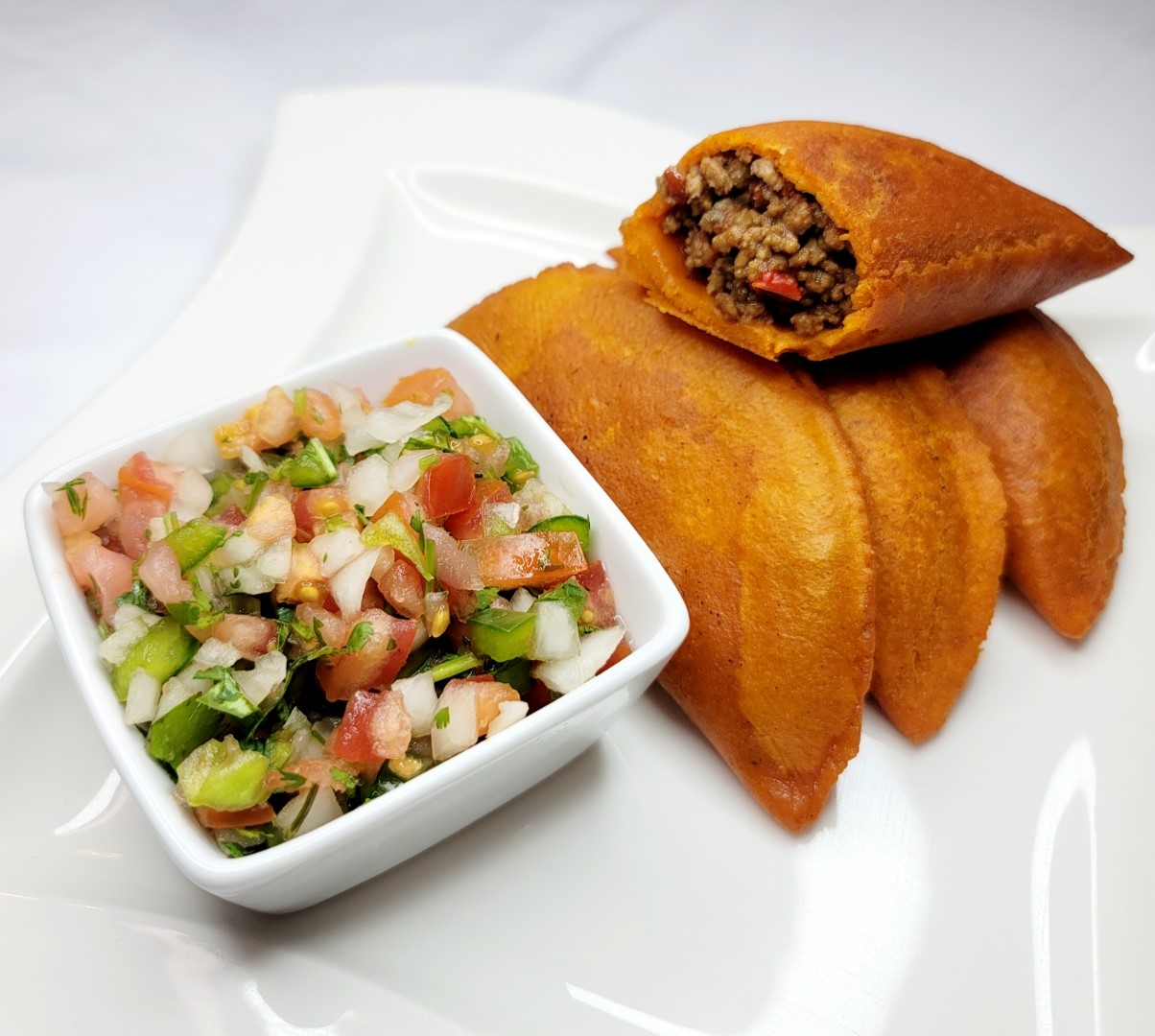 Golden fried empanadas filled with seasoned meat, served with fresh pico de gallo