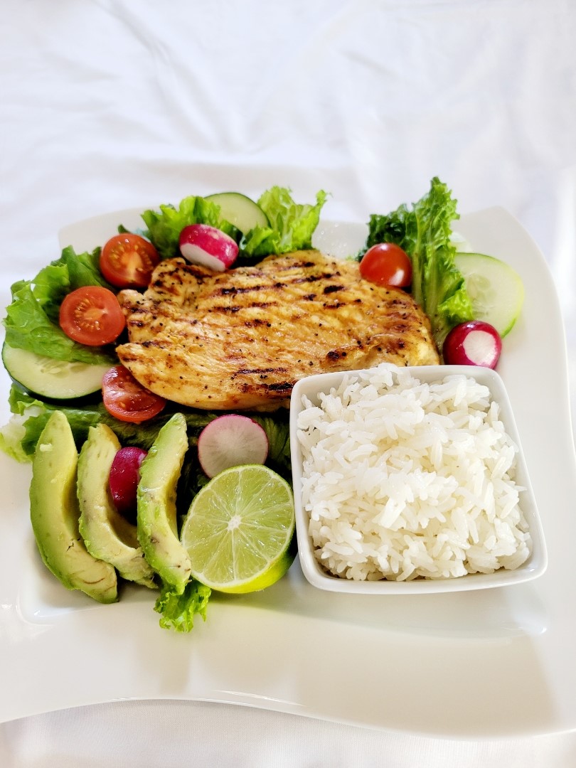 Perfectly grilled chicken breast with avocado, fresh vegetables, lime, and fluffy white rice